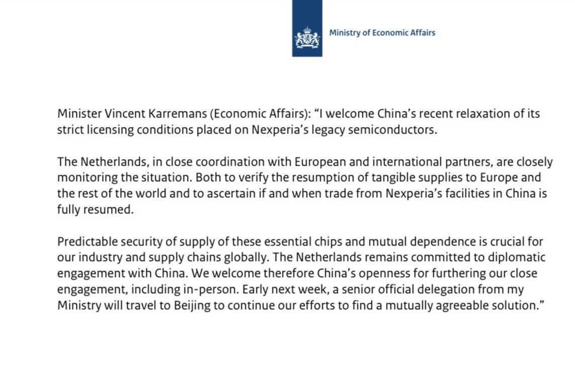 11月13日,荷兰经济事务部长文森特·卡雷曼斯(Vincent Karremans)表示,荷兰政府代表团将于下周初赴北京,继续推动双方寻求互利共赢的解决方案。卡雷曼斯在声明中表示,“我对中国近期放宽对Nexperia (600745.SS) 公司传统半导体产品严格的许可条件表示欢迎”。“这些关键芯片的稳定供应与全球产业链的相互依存,对荷兰工业发展至关重要。荷兰始终致力于与中国保持外交往来,因此我们欢迎中国进一步开放合作,包括恢复线下交流。”